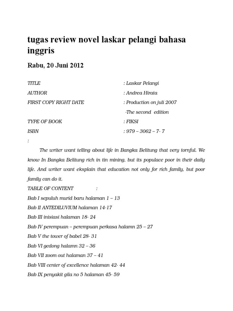 Mengidentifikasi Struktur Dan Unsur Kebahasaan Teks Ulasan Laskar Pelangi from imgv2-1-f.scribdassets.com Sebelum saya melakukan kritikan terhadap novel laskar pelangi, saya akan menganalisis novel tersebut terlebih dahulu. Hari pertama pembukaan kelas baru di sekolah sd muhammadyah menjadi sangat menegangkan bagi dua guru luar biasa, muslimah (cut mini) dan pak harfan (ikranagara), serta 9 orang murid yang menunggu di sekolah yang terletak di desa gantong, belitong. Andrea hirata chapter 1 bab 1 sepuluh murid baru pagi itu, waktu aku masih kecil, aku duduk di bangku panjang di depan sebuah kelas. Pagi itu, waktu aku masih kecil, aku duduk di bangku panjang di depan sebuah kelas. Sebatang pohon tua yang riang meneduhiku. Apr 12, 2016 · novel laskar pelangi. Novel laskar pelangi novel yang sangat inspiratif bagi yang punya. Article terkait daftar isi novel laskar pelangi