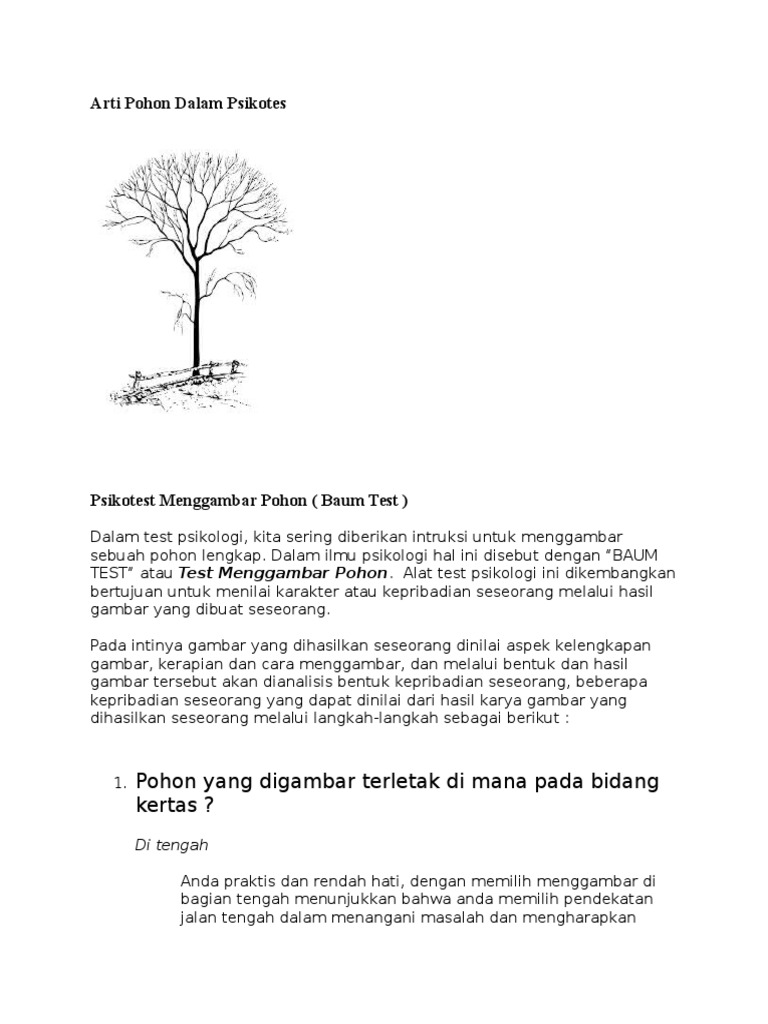 Pohon apa yang kita gambar, tentu mencerminkan bagaimana kepribadian kita. Di dalam sebuah pohon tersimpan satu karakteristik yang mendorong dirinya untuk berkembang dan terus menjadi besar. Dalam tes ini peserta tes diminta untuk menggambar sebuah pohon. Feb 23, 2021 · arti gambar pohon psikotes dilihat dari letak pohon dalam menggambar secara garis besar letak anda dalam menggambar pohon akan menunjukkan kepribadian anda sebagi makhluk sosial. More images for gambar pohon dalam psikotes »