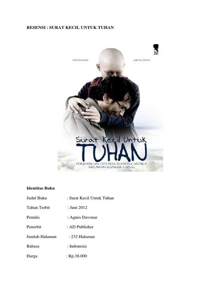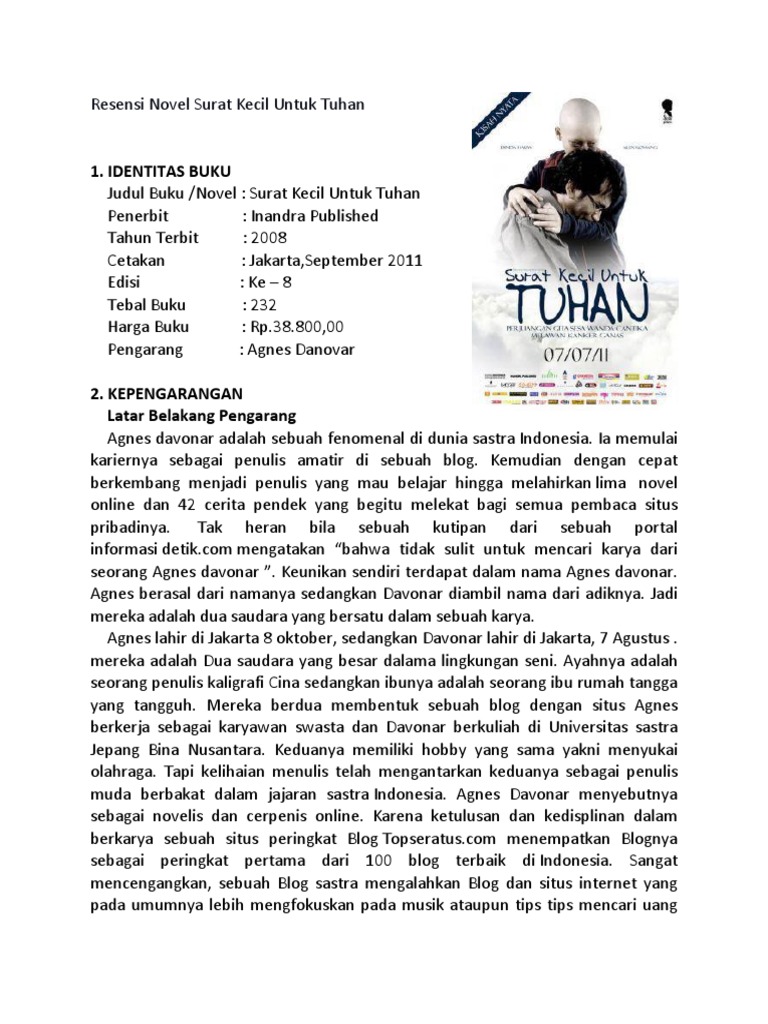 15 Contoh Resensi Novel Fiksi Lengkap Beserta Cara Meresensi from i2.wp.com Gadis kecil inilah tokoh utama dalam novel surat kecil untuk tuhan yang divonis menderita kanker ganas dan diprediksi hidupnya hanya. Ayahnya adalah seorang penulis kaligrafi cina sedangkan ibunya adalah seorang ibu rumah tangga yang tangguh. Feb 24, 2015 · kelebihan dan kekurangan novel surat kecil untuk tuhan kelebihan: Gaya bahasa pada dialog dan alur cerita membuat pembaca seolah menyaksikan langsung kisah keke dalam novel tersebut. Novel ini menceritakan tentang perjuangan gadis remaja dalam melawan kanker ganas, rabdomiosarkoma (kanker jaringan lunak). Di nafasnya terakhir itulah ia menuliskan sebuah surat kecil untuk tuhan. Berbagai langkah pun telah ditempuh oleh ayah keke, namun belum juga menunjukkan hasil yang baik. Pokoknya yang belum baca novel ini harus baca karena sangat bagus dan mengharukan.